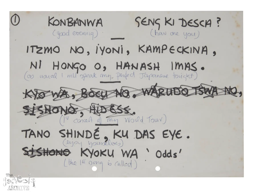 This is the stage announcement that Phil Collins hand wrote, he would have sought out a Japanese speaker backstage and he has written the “Phonetic” way of speaking Japanese.