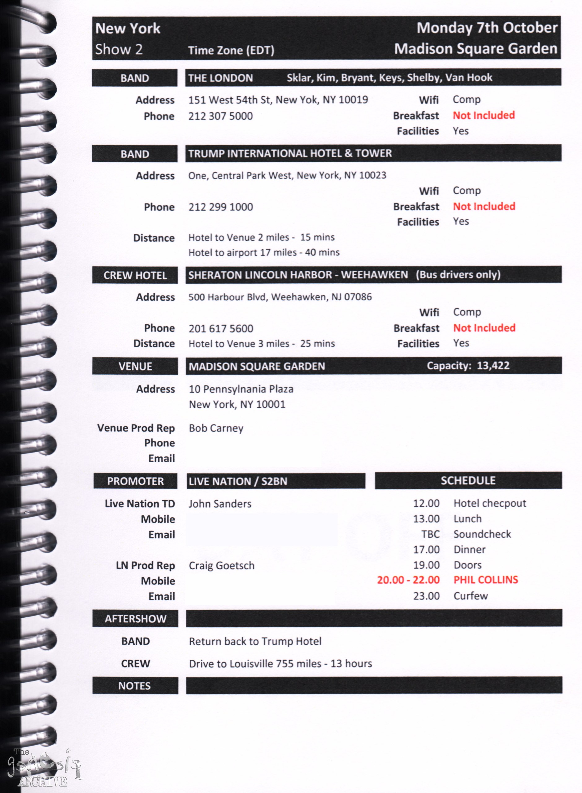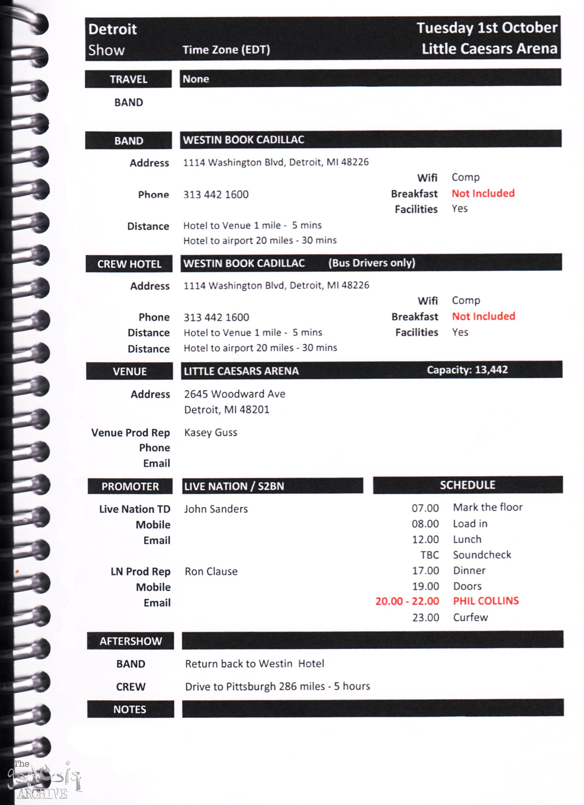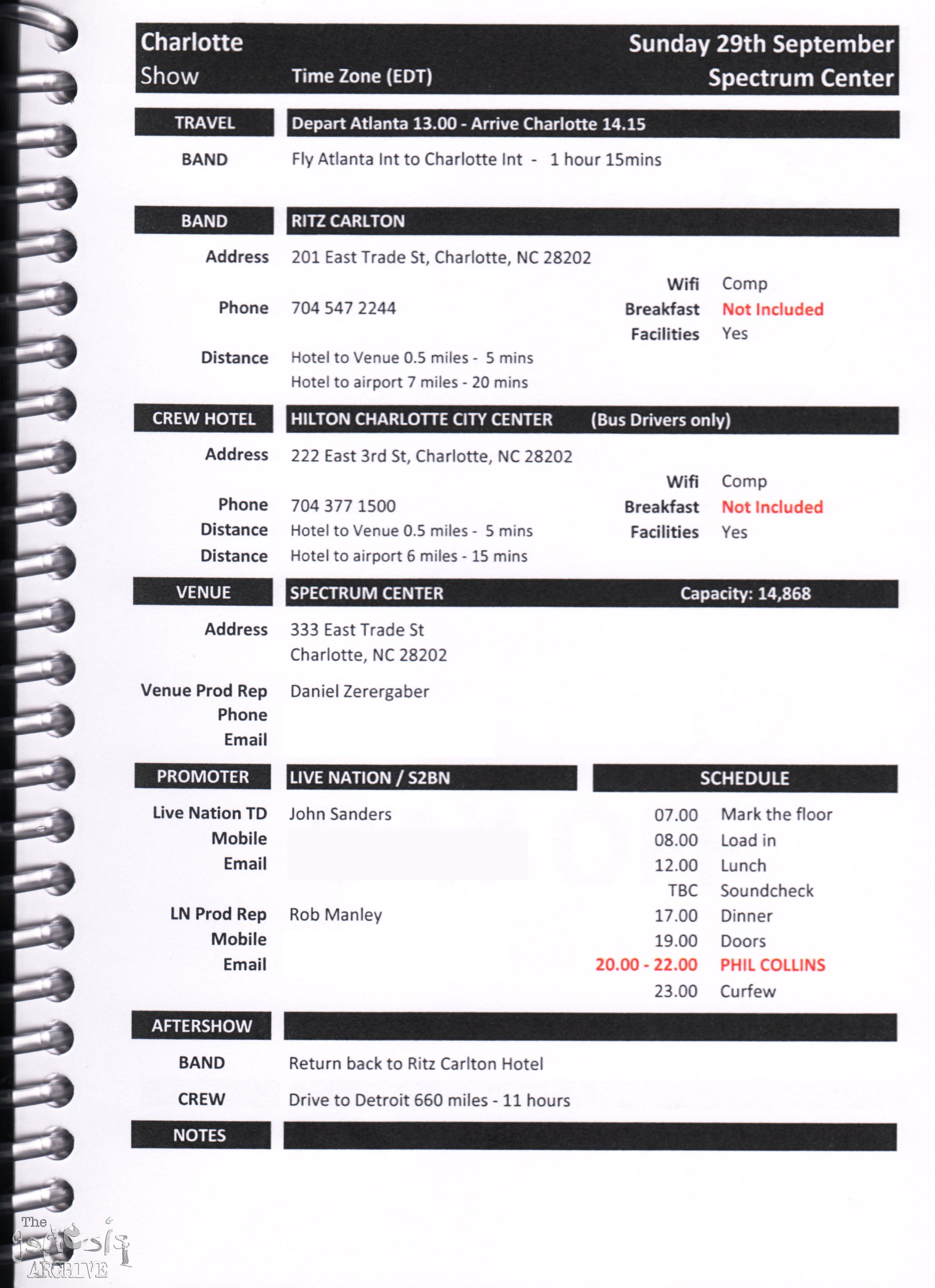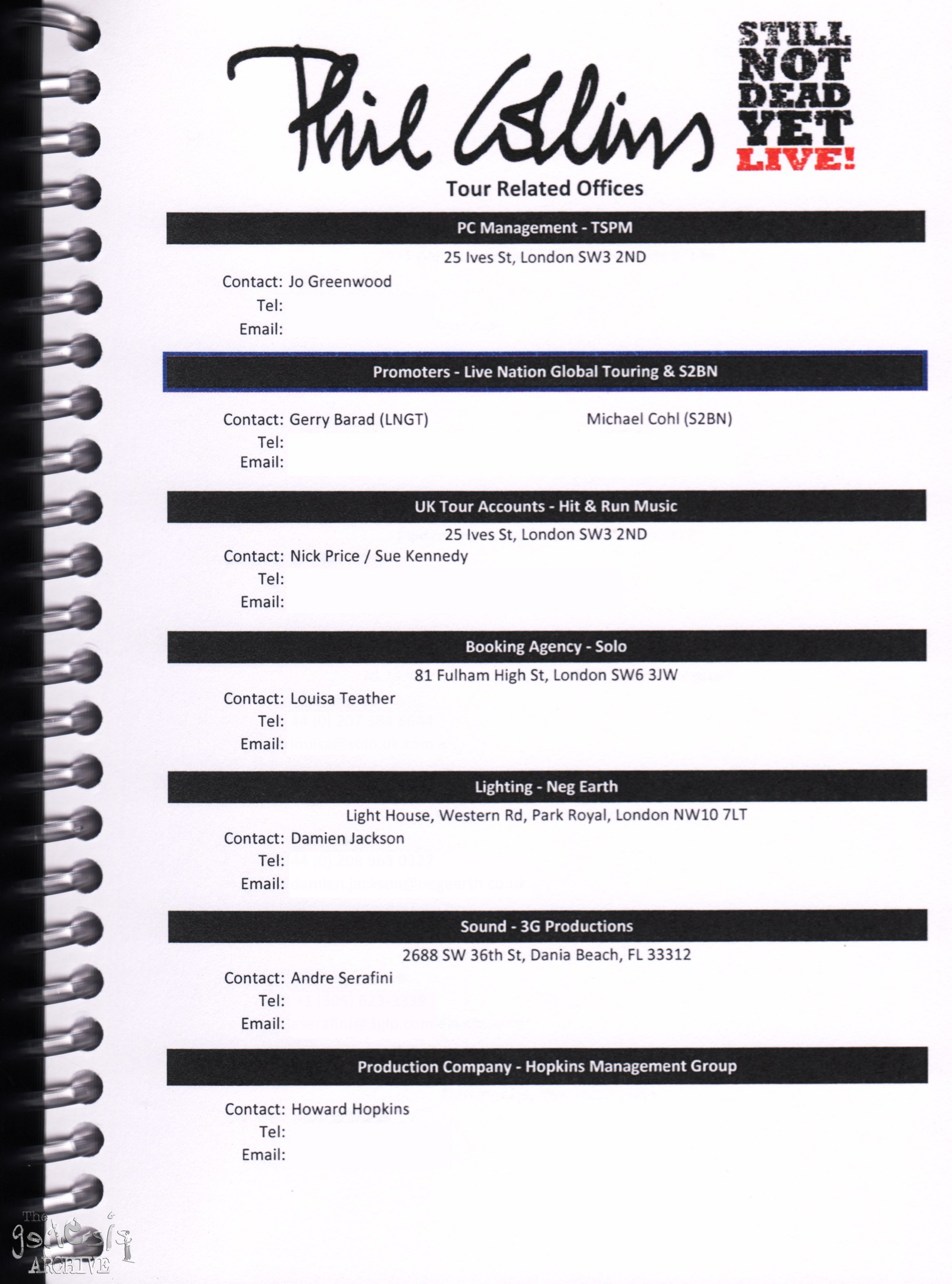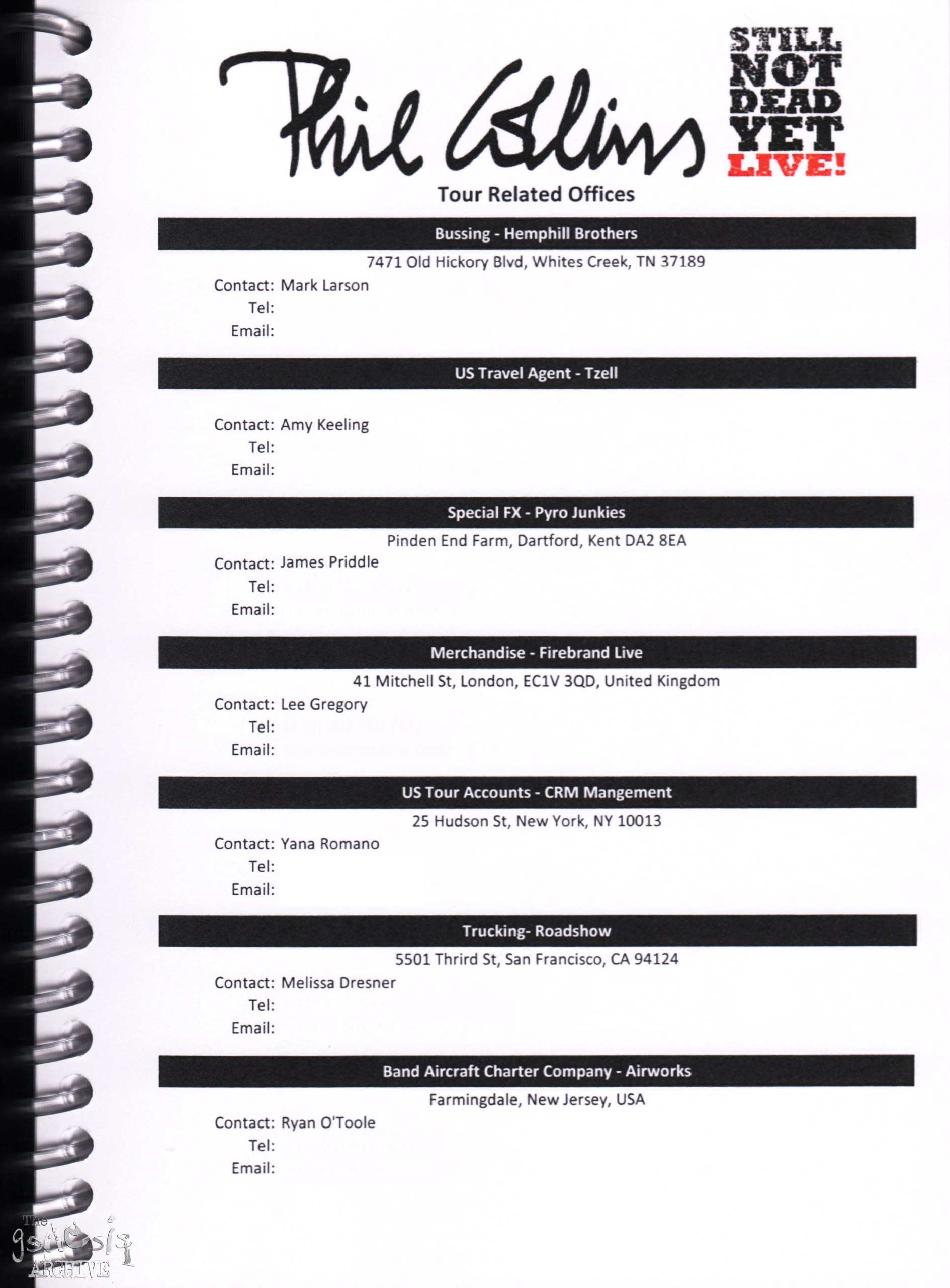 Remember, do not contact any of the companies listed. They will have signed Non disclosure agreements, so they cannot talk about the band/tour etc.