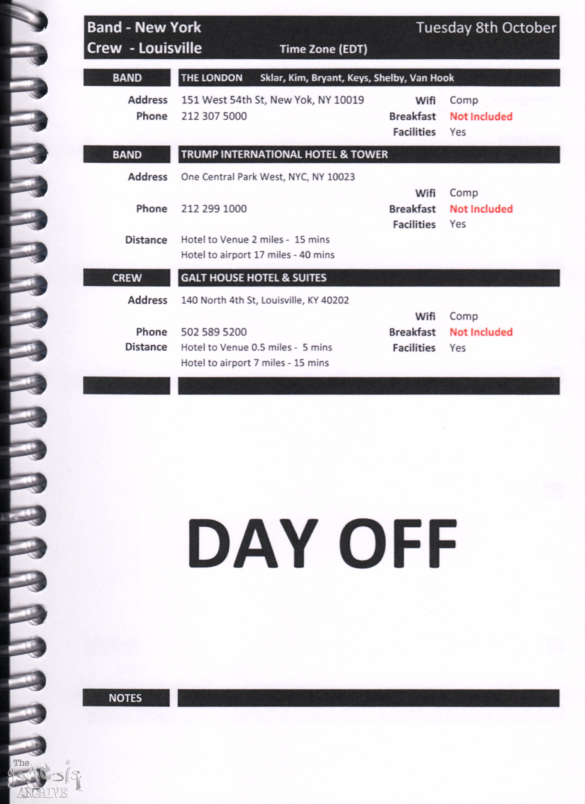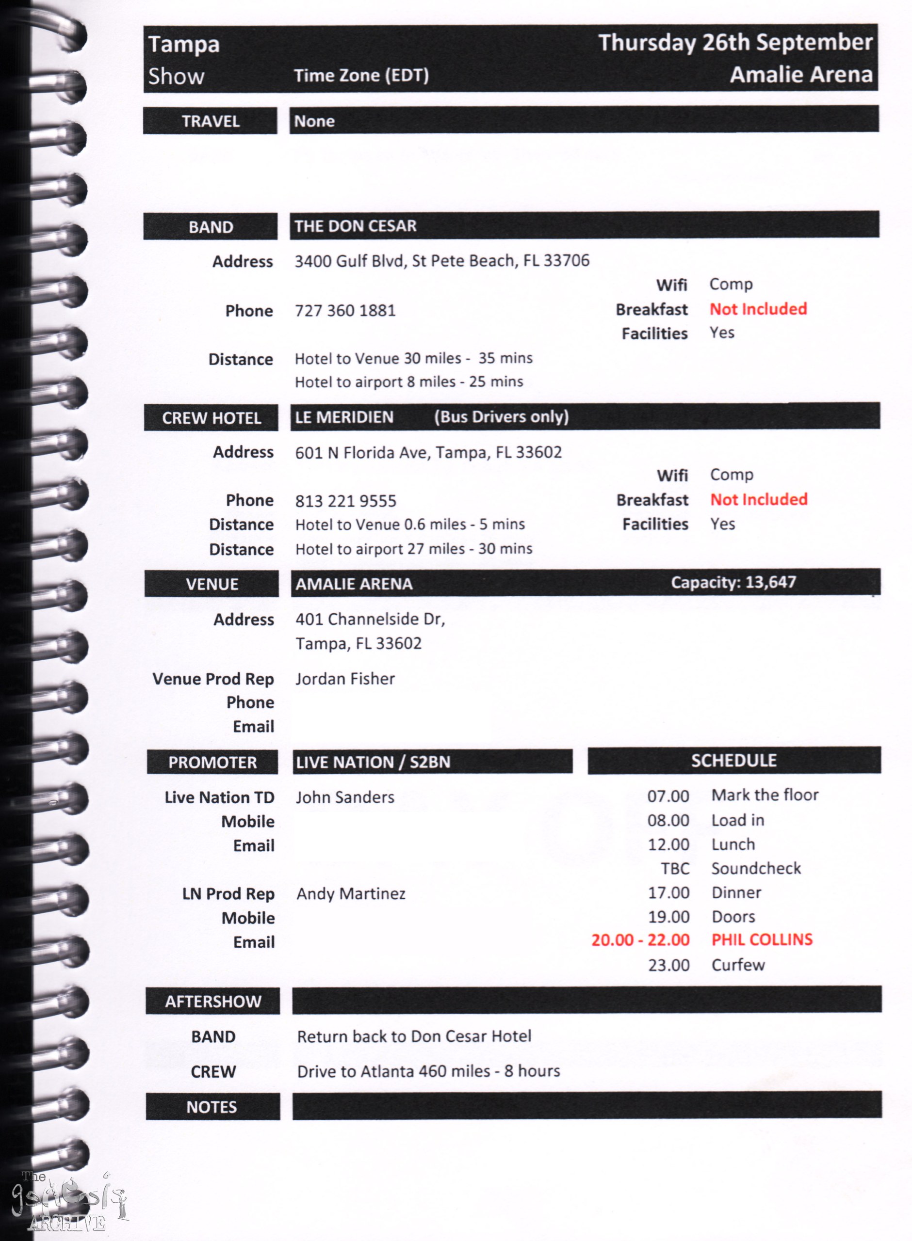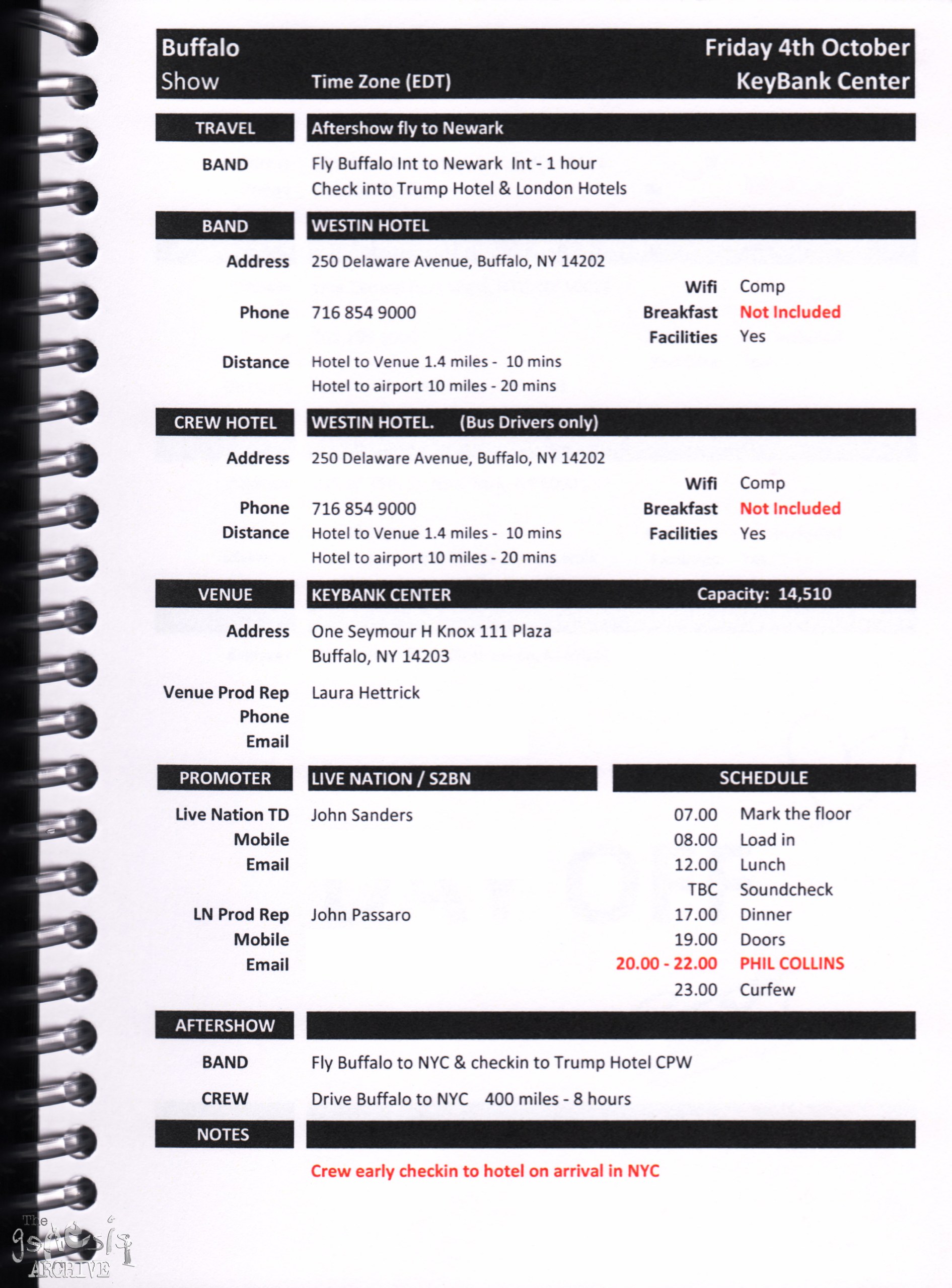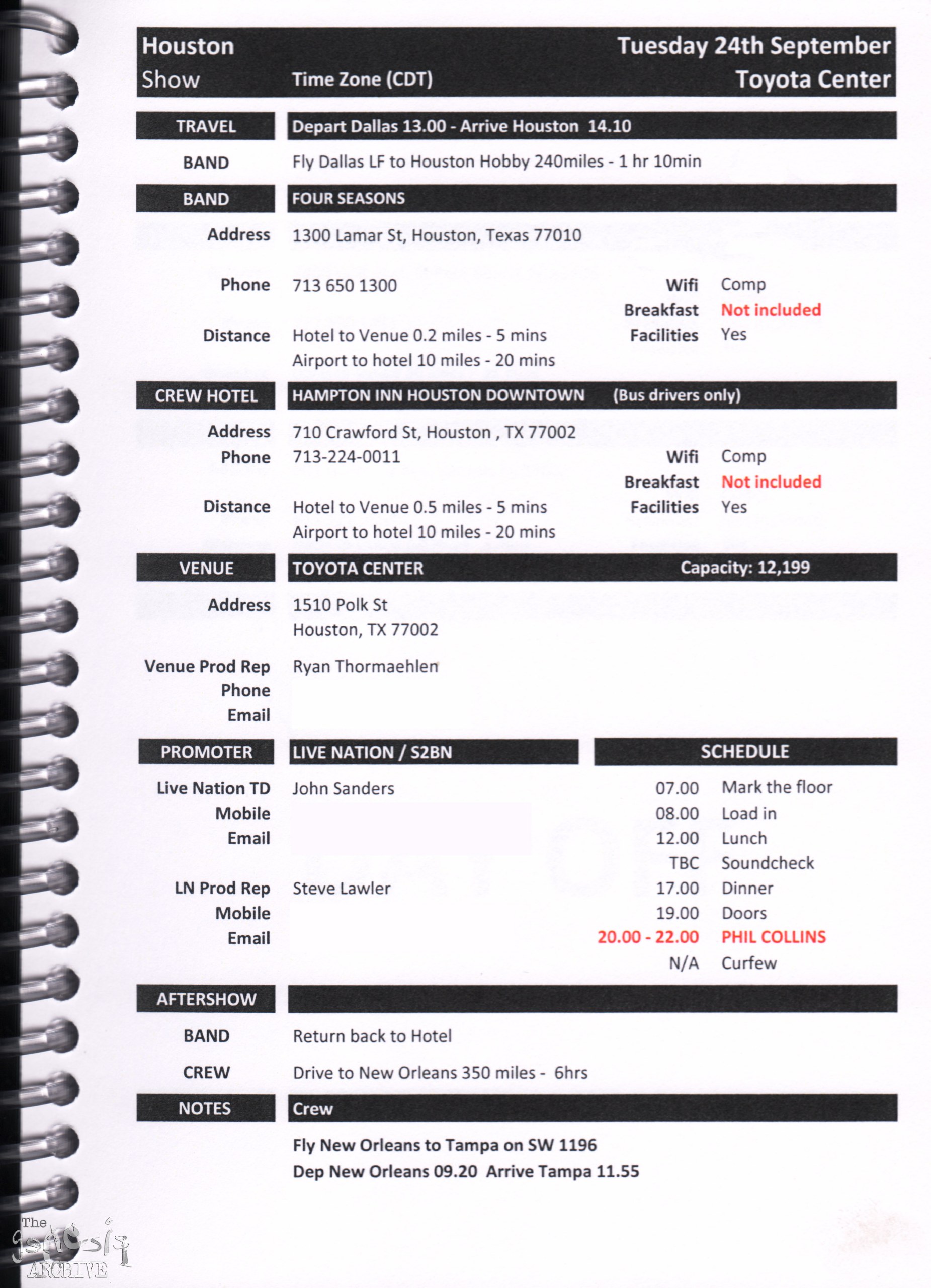 Remember, do not contact any of the companies listed. They will have signed Non disclosure agreements, so they cannot talk about the band/tour etc.
