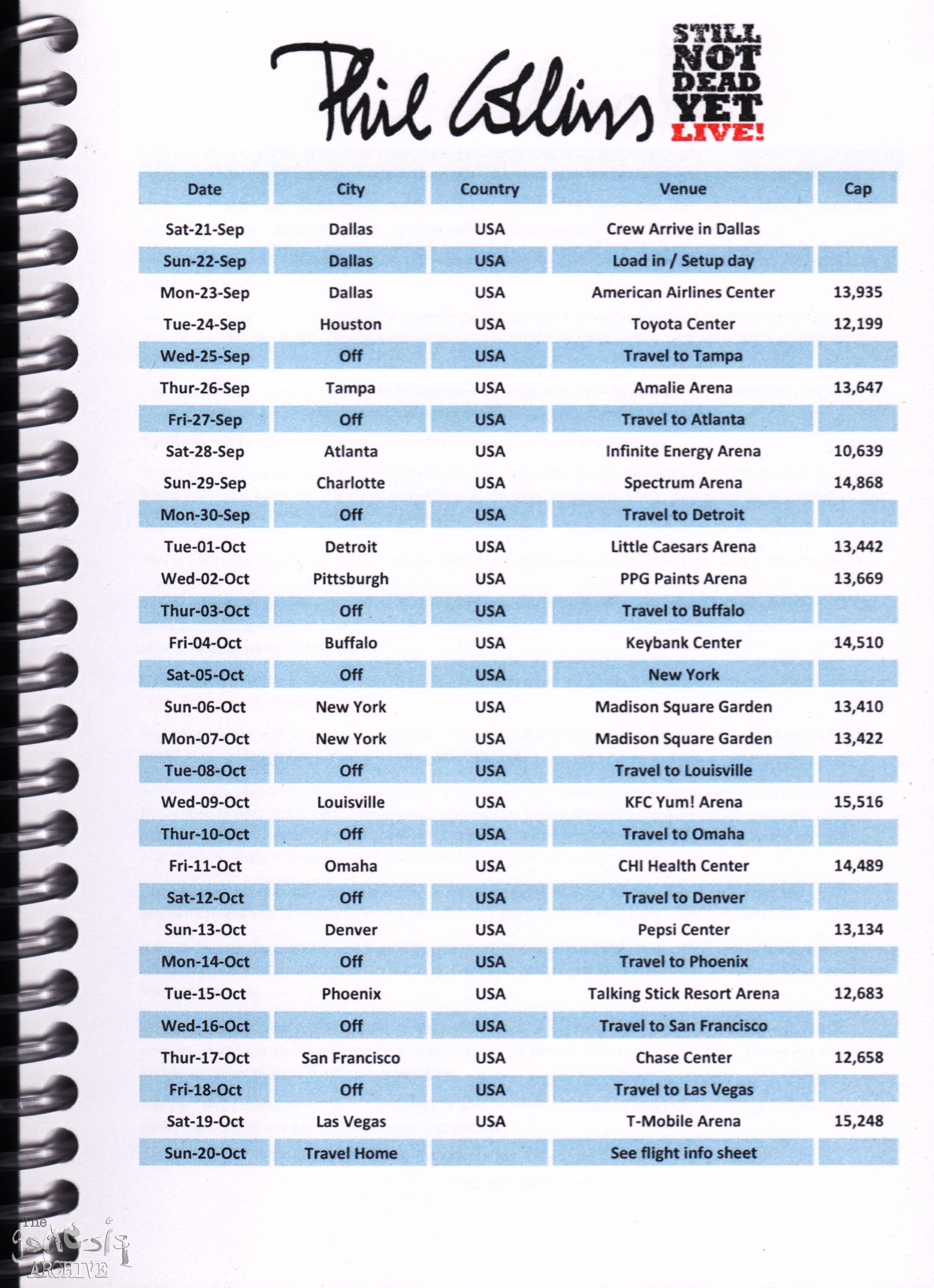 This is a tour itinerary for the 2019 Phil Collins, Not Dead Yet Tour of North America